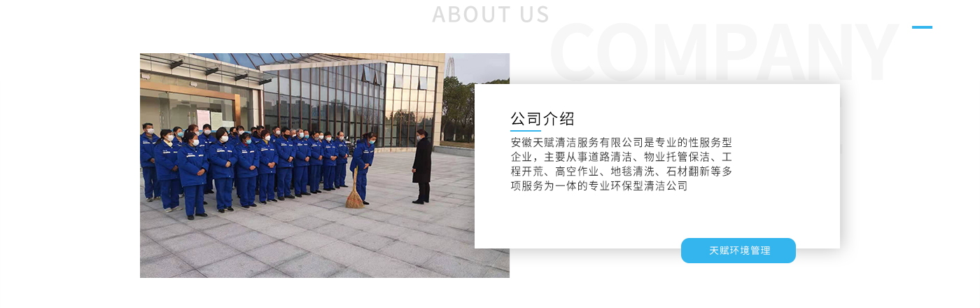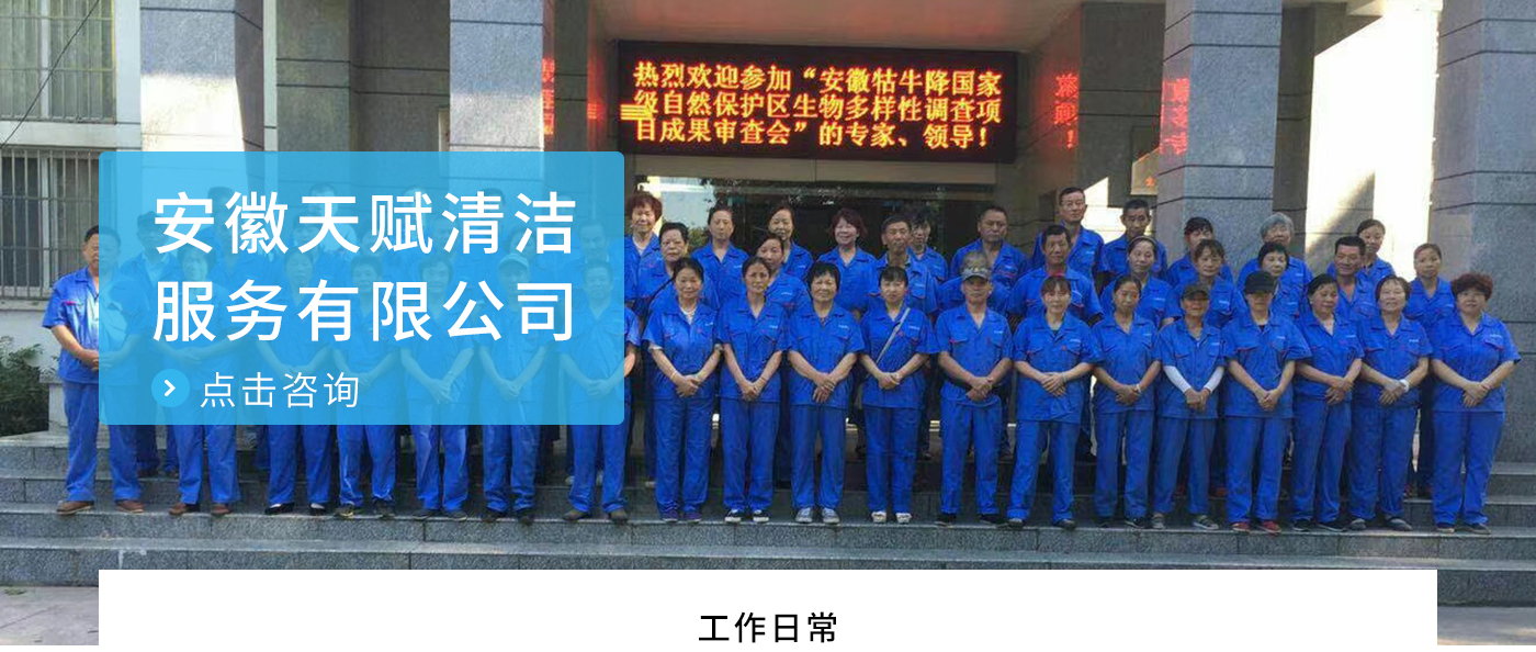 安徽天賦清潔服務(wù)有限公司是的服務(wù)型企業(yè),主要從事道路清潔、物業(yè)托管保潔、工程開荒、高空作業(yè)、地毯清洗、石材翻新等多項服務(wù)為一體的環(huán)保型清潔公司。公司管理機制完善,清潔作業(yè)經(jīng)驗豐富,擁有技術(shù)力量,嚴(yán)格實行崗前培訓(xùn)—崗中督查—上崗在培訓(xùn)的員工管理措施,憑著優(yōu)良的清潔質(zhì)量和嚴(yán)格的督查管理,為眾多企事業(yè)單位、醫(yī)院、酒店、廠區(qū)商場、物業(yè)、道路、學(xué)校、公園等提供后勤清潔服務(wù)。在業(yè)內(nèi)擁有良好的口碑。工作人員,服務(wù)態(tài)度優(yōu),竭力為客戶提供好的保潔服務(wù)。安徽天賦清潔服務(wù)有限公司:致力于長期合作關(guān)系,提高服務(wù)質(zhì)量,提供高標(biāo)準(zhǔn)的清潔服務(wù)。公司的經(jīng)營理念:為營造一個更清潔、亮麗的生活和工作環(huán)境而努力!“誠信”是公司成功保證。“客戶至上,信譽為首”是公司宗旨。高標(biāo)準(zhǔn)提供服務(wù),維護客戶利益、形象,是我始終不渝的目標(biāo)。
